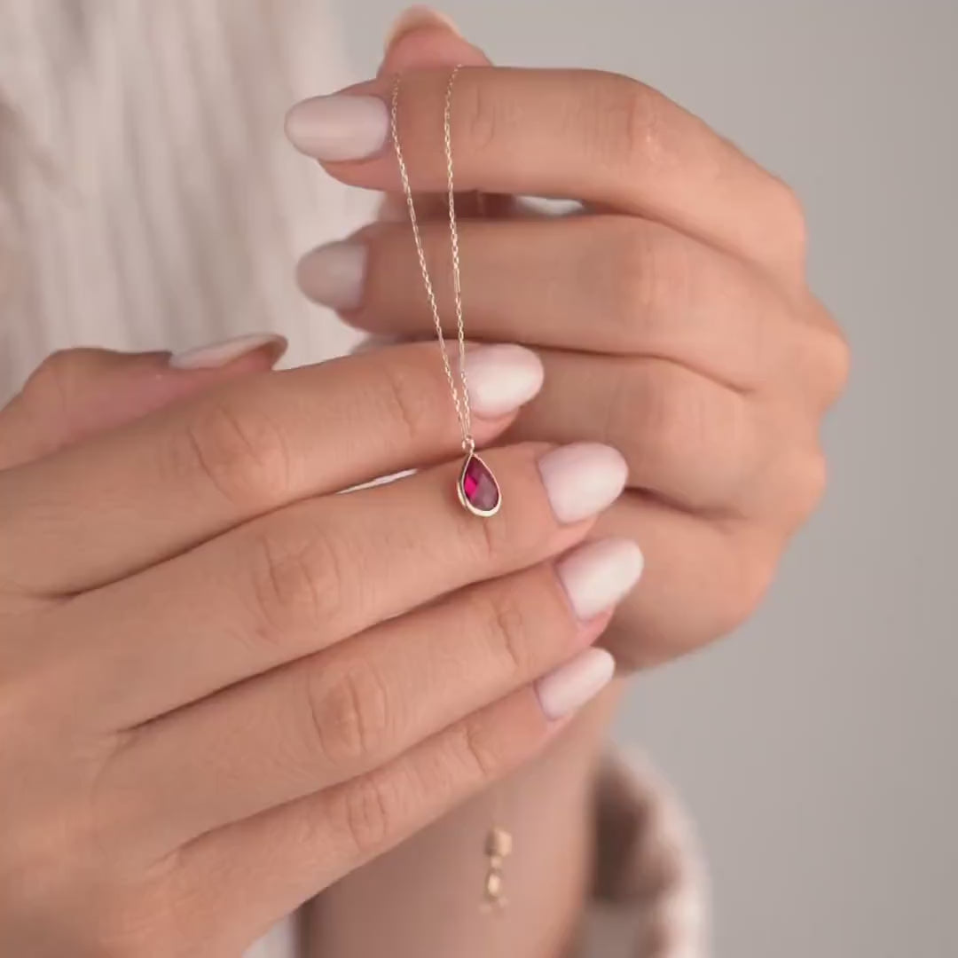 14k Solid Gold Necklace with Ruby Teardrop Pendant, Elegant Gemstone Jewelry, Minimalist Gold Chain, Luxury Gift for Her